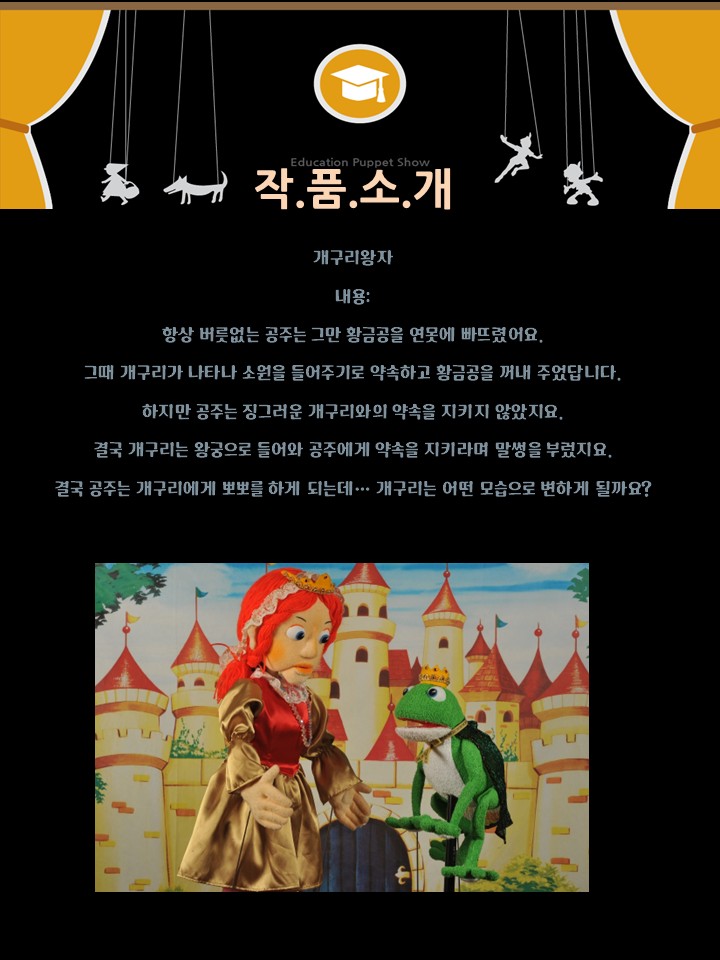 막댄인형극 개구리왕자막대인형, 명작극 개구리왕자내용:항상 버릇없는 공주는 그만 황금공을 연못에 빠뜨렸어요.그때 개구리가 나타나 소원을 들어주기로 약속하고 황금공을 꺼내 주었답니다.하지만 공주는 징그러운 개구리와의 약속을 지키지 않았지요.결국 개구리는 왕궁으로 들어와 공주에게 약속을 지키라며 말썽을 부렀지요.결국 공주는 개구리에게 뽀뽀를 하게 되는데… 개구리는 어떤 모습으로 변하게 될까요? http://puppet.kr/wp-content/uploads/2025/04/슬라이드1-12.jpg 960 720 인형극단친구들 http://puppet2025.mycafe24.com/wp-content/uploads/2016/06/logo.png 인형극단친구들2025-04-13 09:08:172025-11-24 11:22:24막댄인형극 개구리왕자